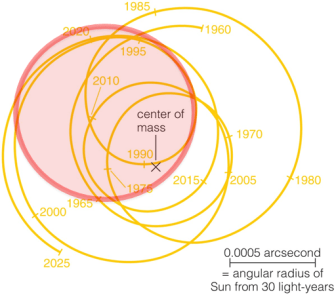 Notice in the diagram above that the size of the Sun’s motion is barely the same as its own size, and the path shown is over the course of decades! (like the orbits of the outer planets.) Obviously, this would be very hard to observe from another star’s distance, and at the very least would require decades of very precise observations.