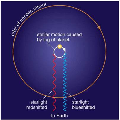 Another method, which has now won a Nobel Prize, measures a star’s planet-induced motion using the Doppler Method. Light from objects moving towards or away from an observer is called “Doppler shifted”; the frequency/wavelength/color of the light is shifted towards the red end of the spectrum for objects moving away from the observer and in the blue direction of the spectrum for objects moving towards the observer.